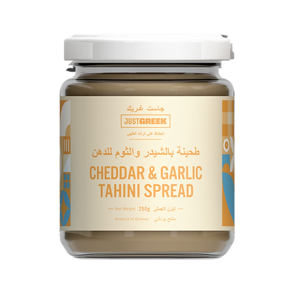 Just Greek's Cheddar & Gralic Tahini spread is a unique twist on traditional Greek flavors. Made with smooth and creamy tahini as the base and is infused with bold cheddar and garlic flavors. A healthy and delicious addition to any snack or meal. Perfect for those who love Mediterranean flavors and want to try something new. Adds a burst of flavor to any dish.